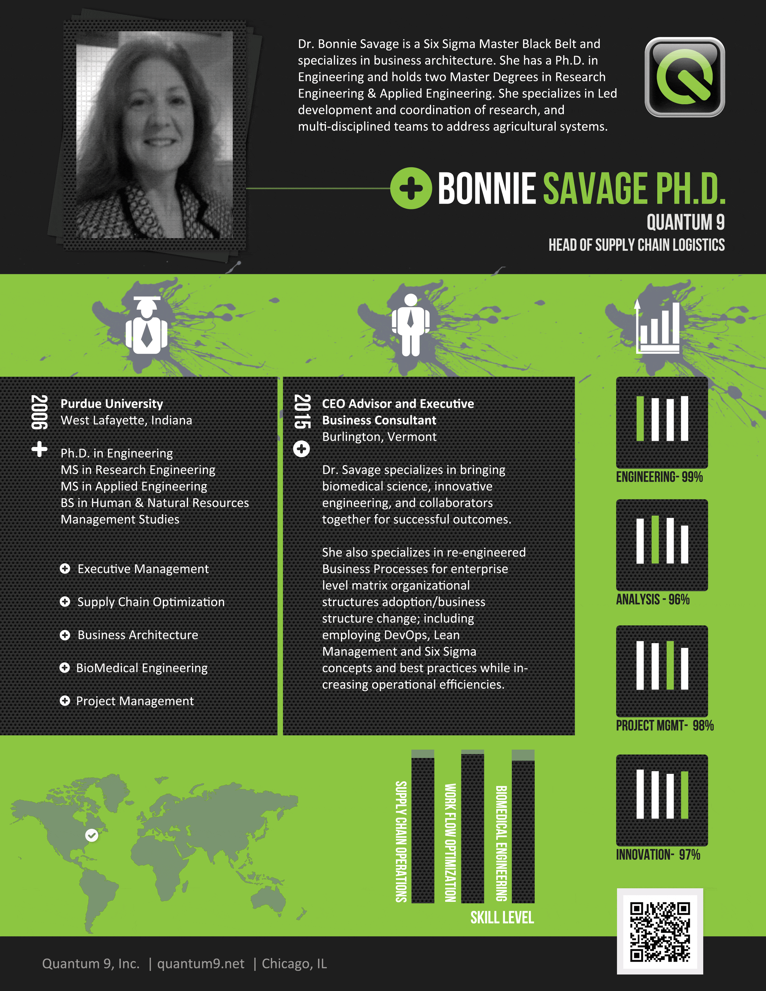 Before the Presidential race saw a change of leadership, $38 million had been set aside to begin rolling the nationally encompassing design for passenger, freight and emergency services designed by Dr. Savage; including a deep component of supporting logistics. Those designed systems accounted for total national level logistics for all interests as well as addressed needs for increasing the Gross Domestic Product (GDP), national safety and security. While demonstrating the practicality of the solution with a case study for the State of Indiana, her work earned her an award as Indiana’s Business Woman of the Year in 2005.